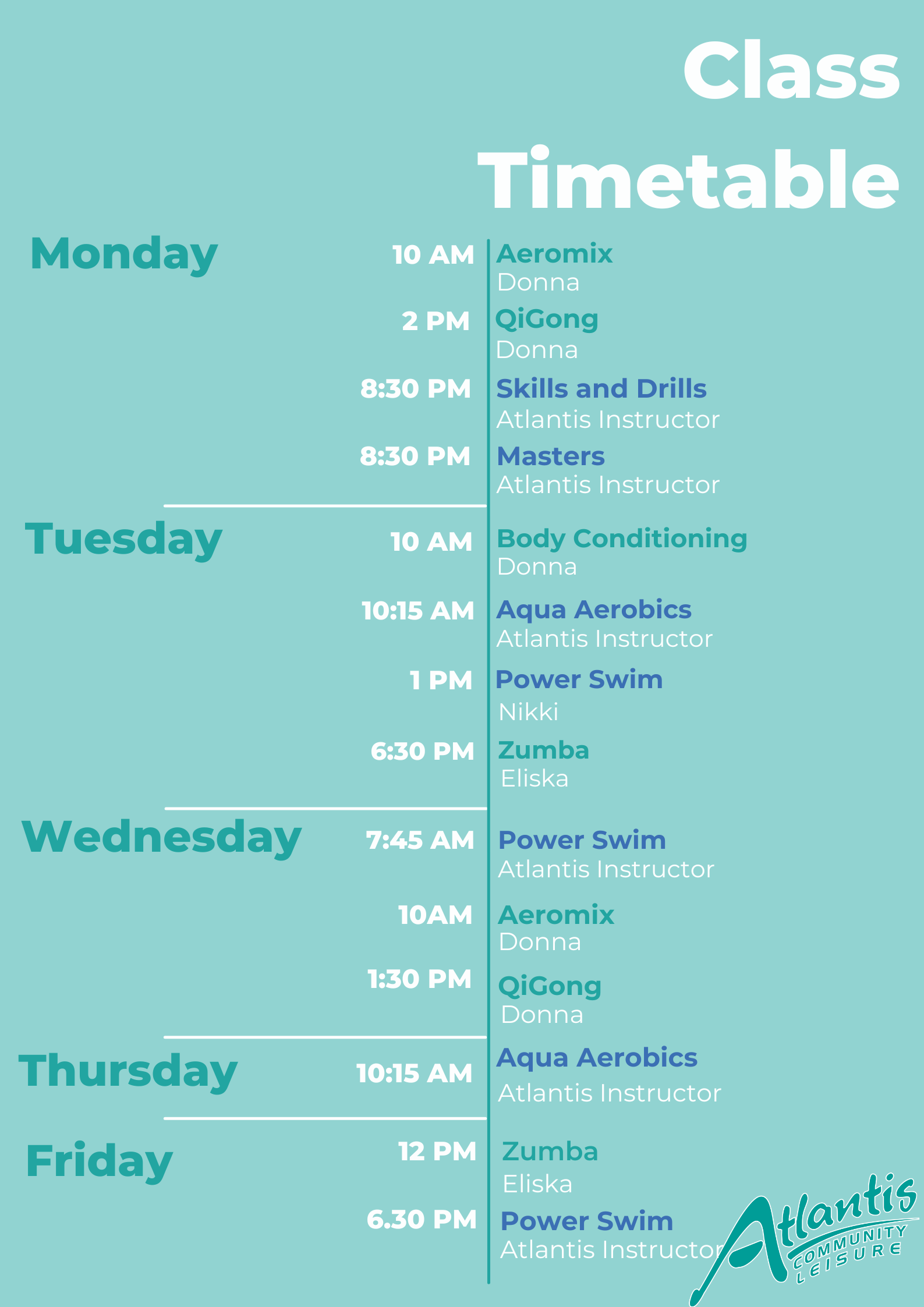 Atlantis classes can be booked through the Atlantis booking system, all community classes are booked directly with the instructor, contact details are below.
