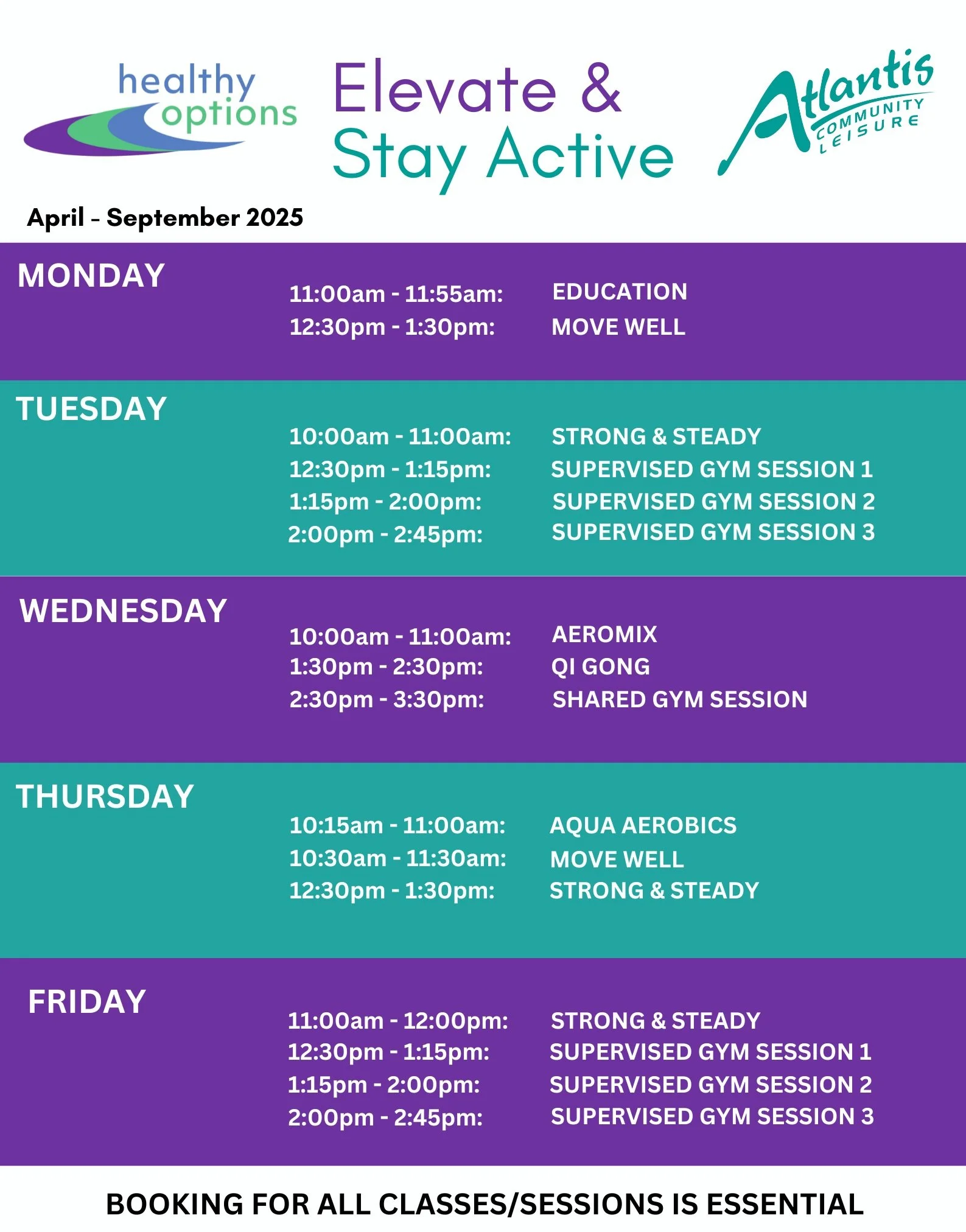 Elevate and Stay Active is a partnership programme between Healthy Options and Atlantis Leisure which draws on our combined skills, knowledge and experience, and the strong partnership we’ve built since 2011. The programme offers a pathway for people requiring low levels of support to participate in physical activity, health and wellbeing sessions.
